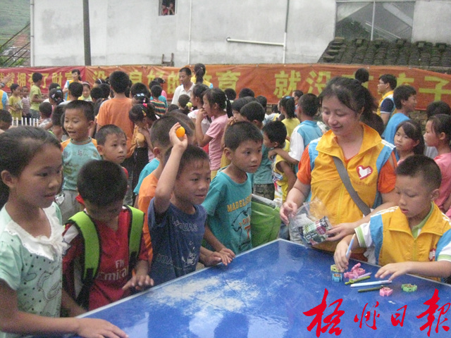 ????5月30日,廣東省中山市香暉園小學(xué)親子義工團成員在與黎垌小學(xué)學(xué)生做擲乒乓球游戲。