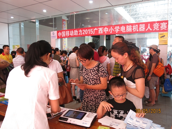 ??? 5月30日上午,梧州市文化展覽中心一派繁忙,2015年廣西中小學電腦機器人競賽暨第十六屆“全國中小學電腦制作活動”競賽項目廣西選拔賽、2015年“亞洲青少年機器人錦標賽”廣西選拔賽在這里舉行。當天,作為協辦單位,梧州移動把一站式的業務服務點也帶到現場,為學生及家長提供業務咨詢及校訊通APP安裝服務。