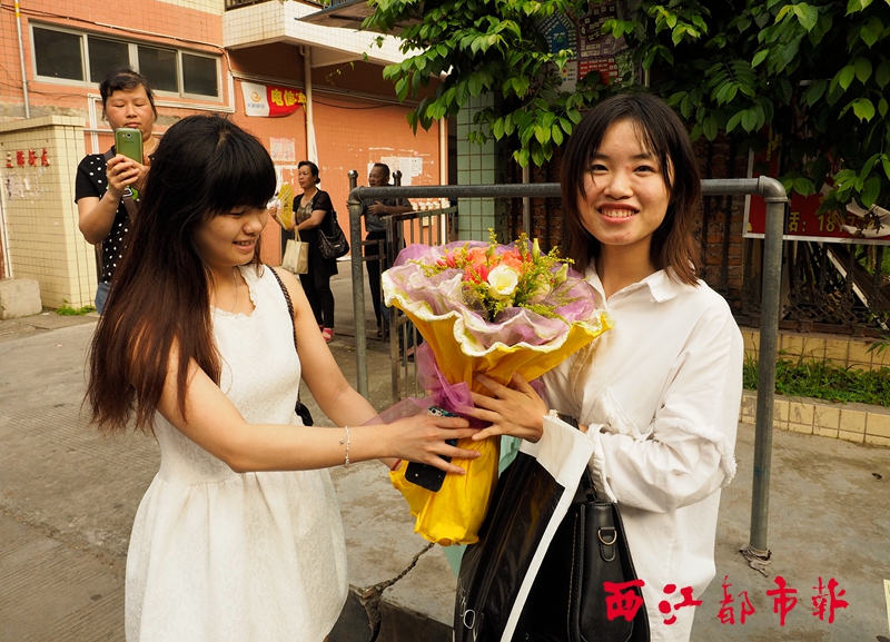 昨天下午,在十五中考點外,收到姐姐送來的鮮花,梧高考生陳迪思(右)驚喜不已。 西江都市報記者 陳健新/攝