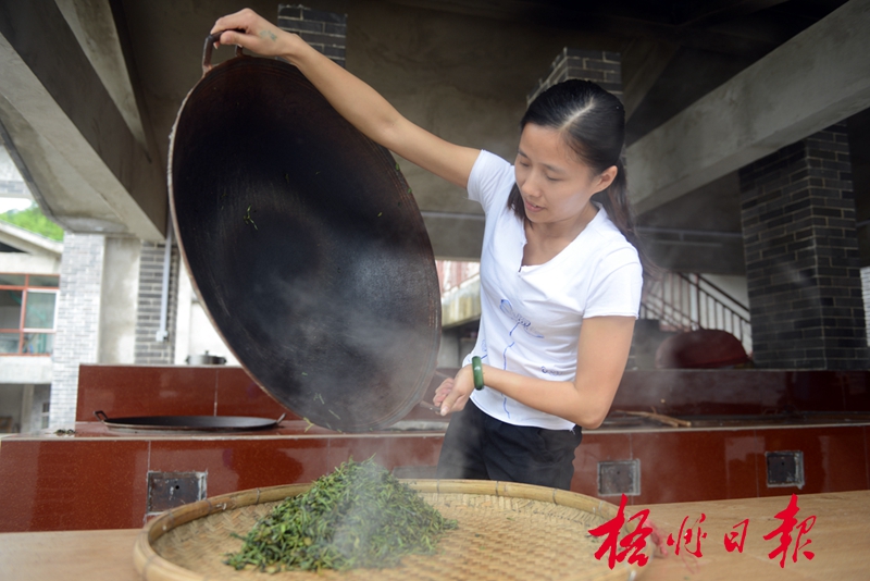 ??? 在蒼梧縣六堡鎮(zhèn)黑石村,石儒菲在自家茶廠練習(xí)六堡茶制作技藝。