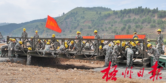 ?6月10日,在梧州市軍地抗洪救災搶險綜合演練中,市交通部門架設“321”裝配式鋼橋,確保搶險道路暢通。
