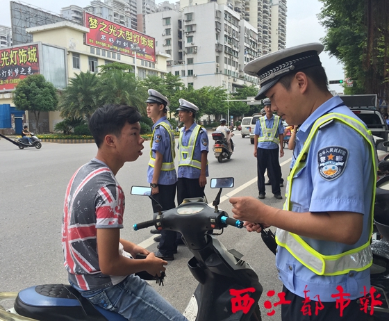 民警正在檢查助力車駕駛員的駕駛證和車輛行駛證。西江都市報記者 楊珊/攝