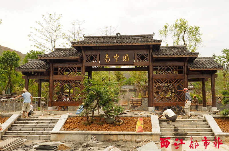 ????6月11日,記者在南寧展園施工現(xiàn)場(chǎng)看到,工人們正在為“情誼人家”、連理亭等主要建筑做最后的清理,部分工人正在亂石板圍墻的縫隙填上水泥,再進(jìn)行勾縫,使亂石板呈現(xiàn)出美觀的紋路。