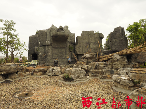 在施工現場,連綿起伏的假山已經矗立其中,小溪河道也已經成型。工人正在為一座涼亭的外墻砌磚,周邊的植樹綠化也在同步進行。一名施工工人說,目前正在建設假山的排水渠,小溪的河道也要清理,下一步還要對建筑物噴上顏色。