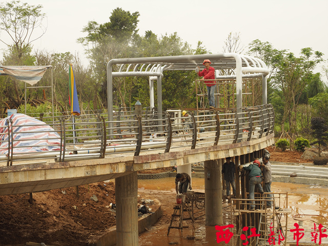 ????柳州展園里,一座環繞中心的架空橋矗立在中間,工人們正在加緊焊接。施工方表示,將對橋身進行噴漆和對展園地面鋪裝瓷磚。“我們還會在架空橋所環繞的中間的花壇里放置一個有汽車元素的雕塑。”
