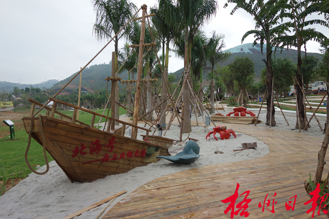 北海園的人工沙灘和螃蟹、船體模型。梁萍 攝