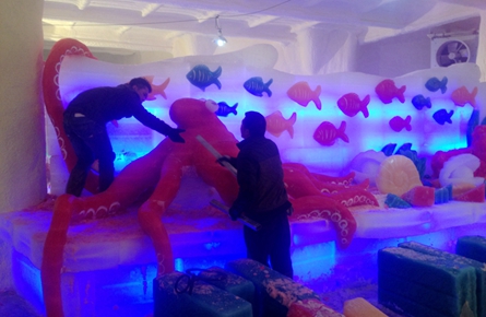 ????這一片藍,把我們牽引到騎樓花架廣場。廣場上,施工人員正在啟用吊機把盆景輸送到高約十米的不銹鋼傘狀花架上,梧州市花三角梅在頂端開放搖曳,形成一個個在空中綻放的錦繡花團。腳下有景,空中造景,錯落有致的景致分布,讓眼睛應接不暇。