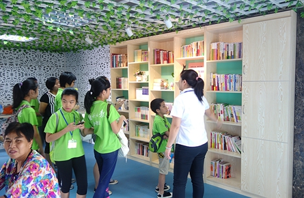 ????在南國風情廣場入口,頭戴寶巾花、脖繞翠綠葉、身著水紋衣的園博園吉祥物“寶寶”笑臉相迎,引領著我們踏上了園博園之旅。竹木材質的斗笠狀亭子,以及沿途高大的樹木,營造出濃郁的南國人情。腳步踏入了一片藍色的海洋,地面由大片的色塊組合,有天藍、湛藍還有白色,三者呈現巨大的流線弧形往前方延續,猶如要與頭頂的藍天連成一片。這一片藍,讓我們發出第一次歡愉的呼喚。