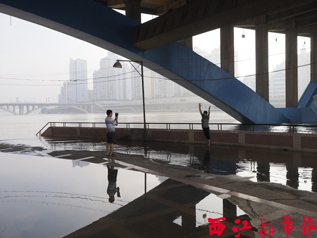 ????6月16日早晨,兩位市民在鴛江大橋橋底被水淹的平臺(tái)上拍照留影。連日來(lái),江河水位上漲,不少市民出于好奇,喜歡到河邊了解水情和拍照留影。由于水位上漲,汛情復(fù)雜,建議市民還需注意人身安全。 本報(bào)記者 陳健新/攝