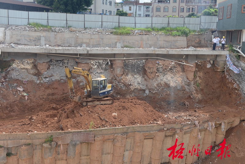 ?6月23日,在新興二路龍山里,施工機械正整修地質災害隱患點坡面。 目前,該地災整治點已完成大部分坡面開挖整修,并完成十多個樁孔加固施工。近日不時出現降雨天氣,施工隊伍在部分坡面鋪上纖維布,防止雨水滲入發生滑坡。