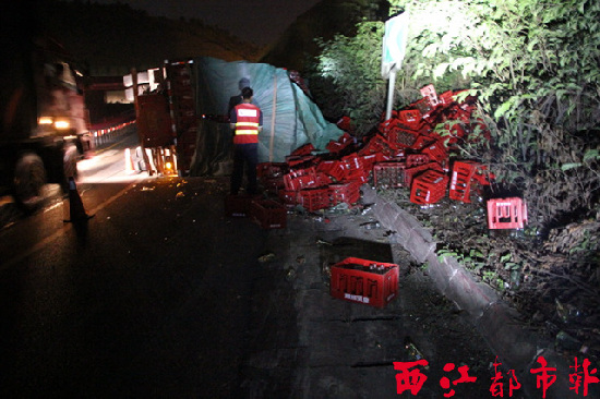 6月29日晚上11時,一輛重型載物大貨車在包茂高速梧州段發生側翻事故,所運載的牛奶瓶子碎片灑了一地。