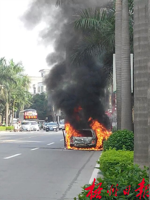 ????7月2日上午,在岑溪市北環大道,一輛小汽車發生自燃,幸無人員傷亡。