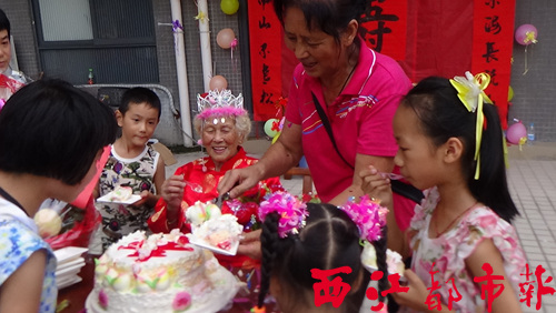 生日派對(duì)上,老人和大家一起分享生日蛋糕。通訊員 馮志然/攝