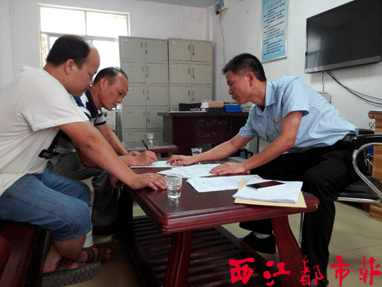 李超云(右)成功調(diào)解了一起民間借貸糾紛案件,當(dāng)事人雙方分別在調(diào)解書上簽字。?本報記者???黃海志/攝