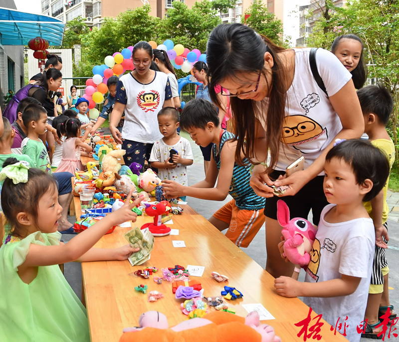 7月4日,在恒祥豪苑幼兒園,一位小朋友向同學推銷商品。