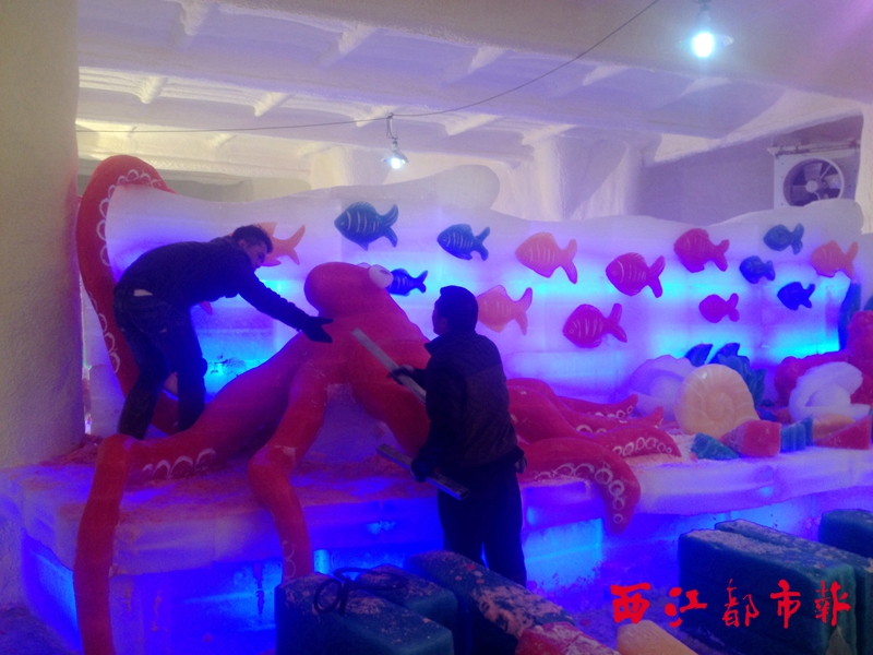 ??? 在玫瑰湖公園內,位于游樂場摩天輪下方的冰雪世界正在建設當中。800多平方米的室內堆疊了五顏六色的冰塊,室內溫度一般維持在零下八攝氏度左右,在炎炎夏日中為市民送來陣陣冰涼。據悉,冰雪世界將在本月中旬與市民見面。