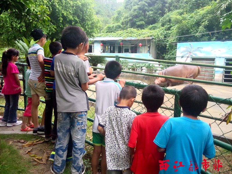 ????早上6時許,天剛剛亮起來的時候就已經有孩子迫不及待地來到了村里的集中地點。經過一個多小時的車程,孩子們首先來到了梧州市動物園,穿梭在綠蔭叢中近距離觀看了河馬、斑馬、孔雀和獅子等動物,連連大呼過癮。