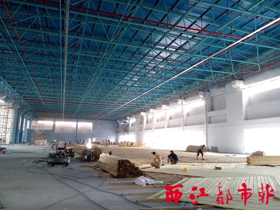 ?位于梧州市綜合館第三層的羽毛球場已現雛形,目前施工人員正抓緊鋪設木地板。吳艷虹/攝