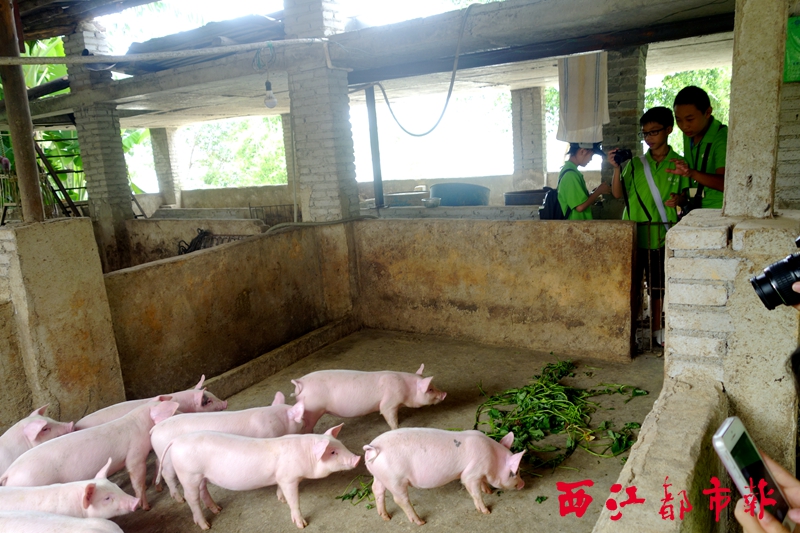 在泗洲村一戶農家的養豬房里,小記者學員看到小豬都很高興。高云/攝