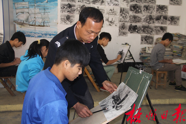 ????“校長,讓我來試試?!焙胃1蛎熳运]。于是,何福彬拿起了粉筆在教室里給學生們上了一節美術課。何福彬扎實的美術功底,贏得了學生們陣陣掌聲,當場有學生表示要跟他學畫畫。由于何福彬不是在編教師,沒有教師資格證,因此他不能像其他老師那樣在課堂上課。于是何福彬收拾了學校一間雜物室當作教室。教室異常簡陋,沒有黑板,窗戶沒有擋風玻璃窗,能用來工作的只有兩張書桌、一支光管。就這樣,在一個寒冷的冬日里,何福彬帶著5名愛好美術的學子就在昏暗的畫室里開講了。大山里的冬天特別的冷,刺骨的寒風透過窗戶,吹得大家鉆心的冷。何福彬和同學們頂著嚴寒,開始了他們的第一節美術課。