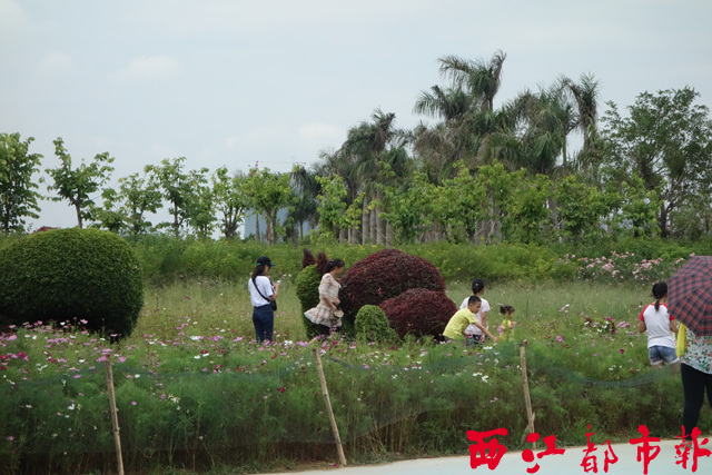 在園博園西區主入口的格桑花展示區中,幾名游客越過展示區的圍欄踏入花叢中。西江都市報記者 謝韻/攝