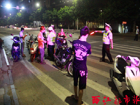 ????西江都市報訊(記者 楊珊 通訊員 賓佳欣)針對市民反映強烈的深夜飆車現象,交警部門再次重拳出擊進行整治。7月15日晚11時至次日凌晨2時,梧州市公安交警支隊聯合特巡警支隊,在市區西堤路一帶設卡設點,拉開了以整治“飆車黨”為重點的突擊行動。