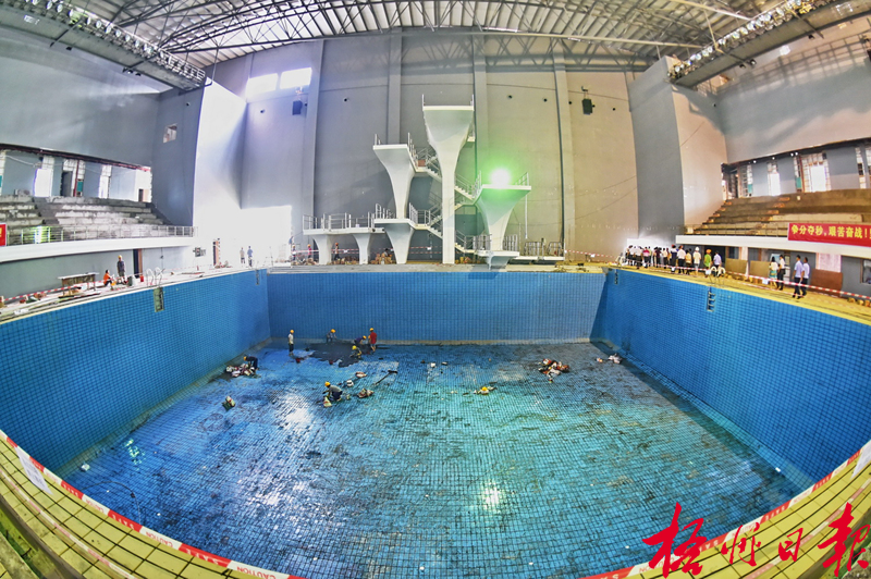 ????作為我市承辦第十三屆區運會主場館之一的游泳(跳水)館,將承接游泳、跳水項目的比賽。目前場館主體結構已建成,施工方正在進行池底檢查,以及消防給排水、賽池水處理設備的安裝和調試,7月底可竣工并投入使用。 孟亞西 攝