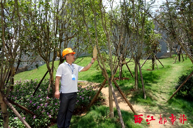 練毅華頂著烈日到園博園查看樹木的生長情況。謝韻/攝