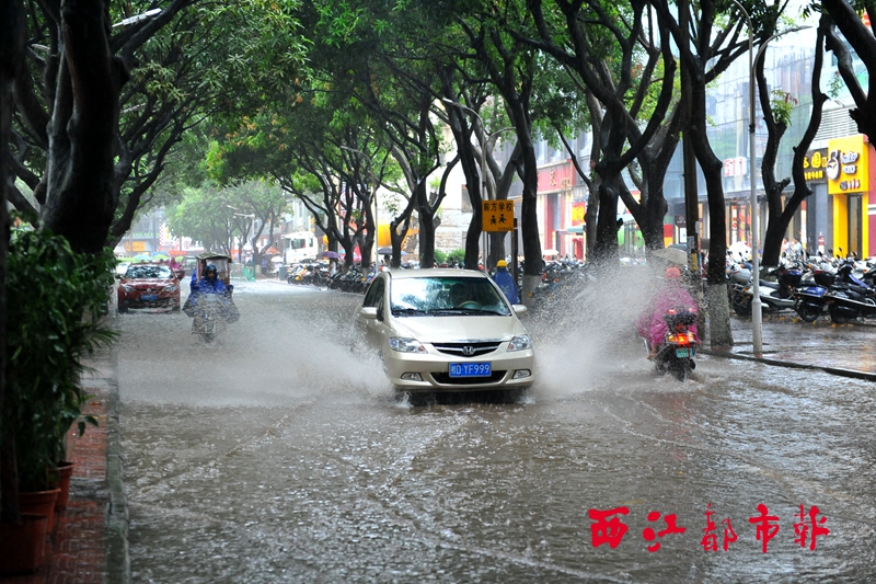 ????當天下午4時30分許,在突如其來的大雨雨勢稍微減弱后,一些路過大學路的市民驚訝地發現,梧州一中初中部門前的近百米機動車道變成了一條“小河”。積水的路段主要為梧州一中初中部門前至大學路與文瀾路交界路口附近,積水深度約為15厘米。每當車輛開過,道路的積水就蕩起水波,猶如水中行舟。