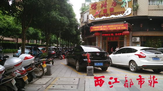 ????7月21日上午,記者來(lái)到迎賓路了解情況。記者看到,在儒膳房酒店所處路段機(jī)動(dòng)車(chē)道上的停車(chē)位已基本停滿(mǎn)車(chē)輛,而人行道上則停放了許多摩托車(chē)及數(shù)輛小汽車(chē),這些小汽車(chē)所停之處的地面上,有用黃色油漆劃出的不規(guī)則的“停車(chē)位”。記者走近觀(guān)察發(fā)現(xiàn),這些不規(guī)則的“停車(chē)位”上,還寫(xiě)著“用餐專(zhuān)用”四個(gè)字。亂停亂放的摩托車(chē)以及小汽車(chē)使該路段的人行道被隔斷,還導(dǎo)致盲道的不順暢。
