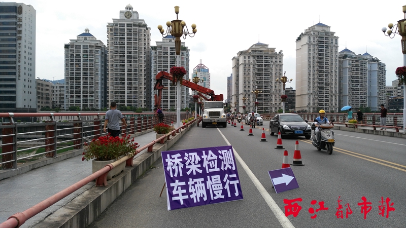 ??? 7月23日,技術(shù)人員在桂江一橋開(kāi)展橋梁檢測(cè)作業(yè)。