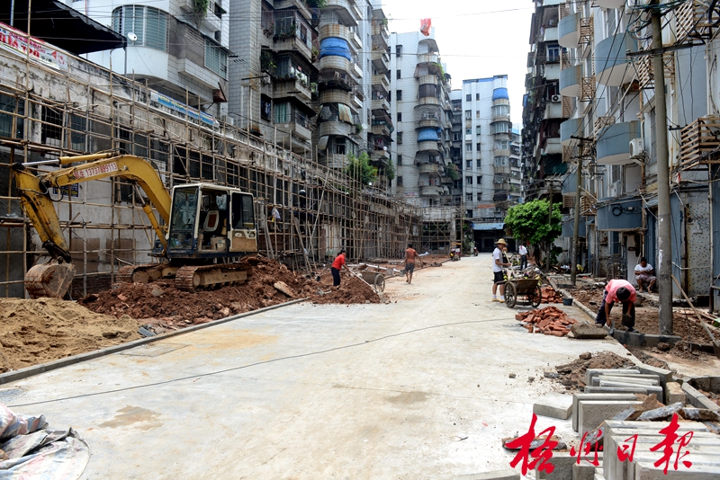 ??? 7月22日,在大塘市場附近住宅區(qū),工人正在改造道路。