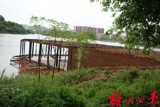 ????7月23日,記者在玫瑰湖公園游樂場對出位置看到,施工現場采用藍色鐵皮隔離,隔離鐵皮上并有張貼項目信息公示。施工項目利用湖邊的半坡地勢正在修建一個鋼架結構挑臺,挑臺呈半圓形,負一層地面已經硬化,與沿湖馬路平行的一層則正在平整地面,整個項目占地約1000平方米?,F場,工人正在修建通往負一層的梯級。