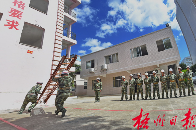 ????7月31日,市公安消防支隊萬秀消防大隊官兵與兼職消防員冒著烈日開展消防救援訓(xùn)練。
