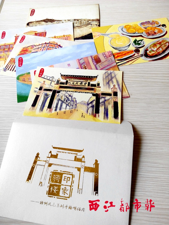 ????如今,朱欣和萬幸還成立了“知趣工作室”,并陸續創作出了“梧州印象”和“梧州美食”系列的明信片,她們希望更多的梧州風土人情和美食得到銘記和傳播。 |