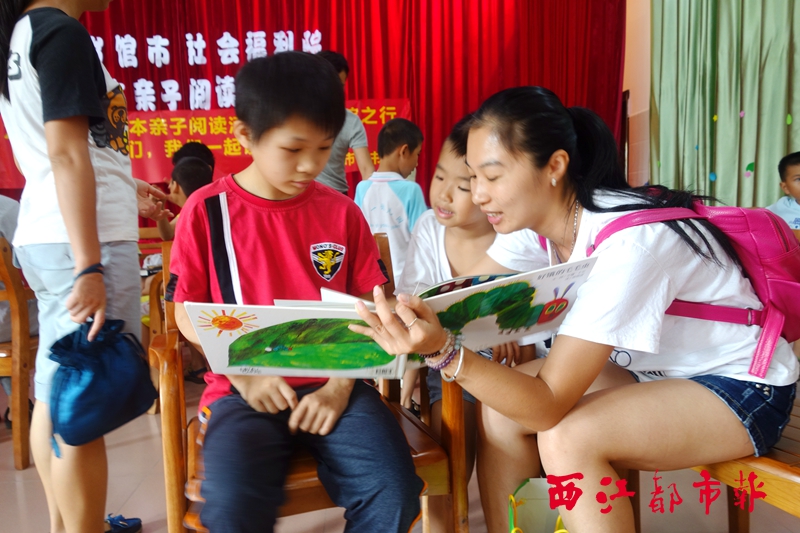 ??? 西江都市報訊 (記者 高云 實習生 覃珊珊 通訊員 汪雁)8月5日上午,梧州市圖書館在梧州市社會福利院開展繪本親子閱讀活動。活動組織了25個讀者家庭與10多位殘障兒童進行面對面交流,讀者家庭成員為那些缺少家庭溫暖的孩子講故事,用書籍、閱讀撫慰他們幼小的心靈。