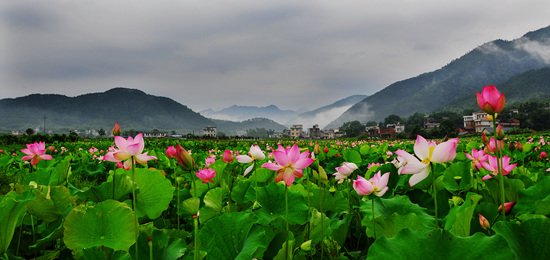 ??? 蓮界千峰靜,梅天一雨清。當友人告知我五月已有初開的蓮花,我始自鄉間孤獨行來。就在蒙山城北的高堆村,一大片一大片,從星星點點,到群艷齊發。古城永安,本就因其綿厚的歷史人文的蘊藏,聲傳遐邇。蒙山縣偏安一隅,民風淳樸,空氣凈好,就是荷花,也是生成一片儒雅模樣。所有的荷塘邊上,必定會有諸多關于蓮的故事在梅雨荷風中婉約起落,我知道。