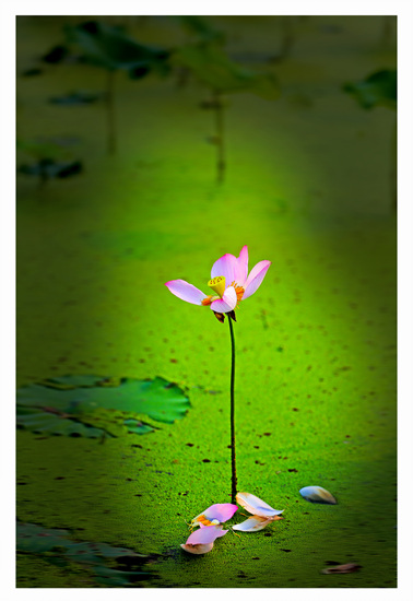????這朵佇立在曲水中的荷花,使我擺脫了多年追逐名利帶來的苦惱,活得充實自在了。在我的心田里,一朵自成風景的荷花盛開了。(吳廣升) |