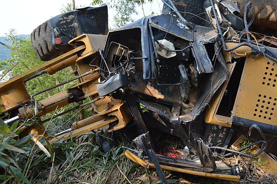 16時26分,消防官兵到達事故現場。經消防官兵現場觀察發現,鏟車是從墜毀處上方約9米的工地上墜落。墜落的鏟車已完全損毀,駕駛室嚴重變形,駕駛員頭部朝下被牢牢地卡在駕駛室里面,渾身上下都是傷口和血跡,現場醫護人員正在進行緊急救治,情況十分危急。