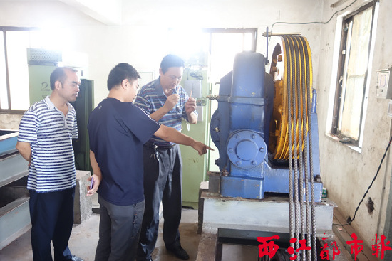 8月9日,廣西特檢院梧州分院的工作人員對出現故障的電梯主機進行檢查。西江都市報記者 龍天傳/攝