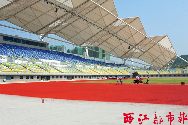 ??? 8月8日,施工人員在梧州市紅嶺體育場(chǎng)內(nèi)的跑道噴灑塑膠涂料。作為第十三屆廣西壯族自治區(qū)運(yùn)動(dòng)會(huì)的主會(huì)場(chǎng),體育場(chǎng)的球場(chǎng)草皮已鋪設(shè)完畢,整個(gè)施工建設(shè)進(jìn)入加緊完善配套設(shè)施的收尾階段。 西江都市報(bào)記者 陳健新/攝