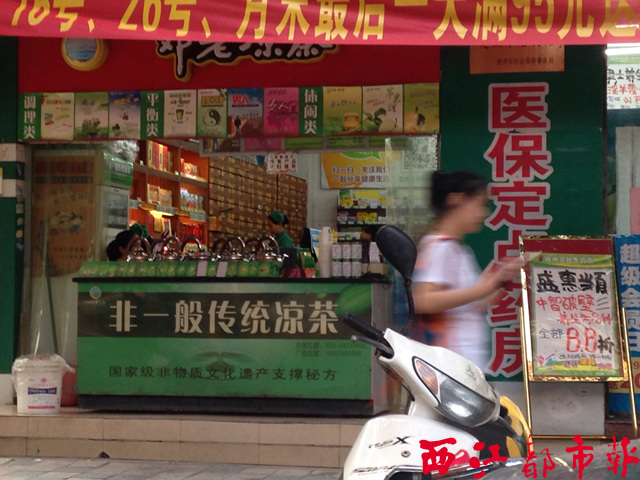 市區(qū)銀湖南路一家連鎖藥店旁邊開設(shè)的一間涼茶店靠近人行道,不少市民路過也會買上一杯涼茶。(凡凡/攝)