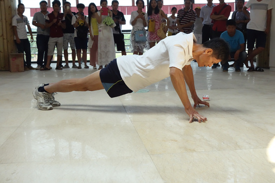 ????為了讓現場氣氛活躍起來,不少男會員挺身而出,有的表演十指俯臥撐,有的在按摩板上跳繩,也有男會員借麥克風進行自我介紹,吸引注意。周強便是其中一個。