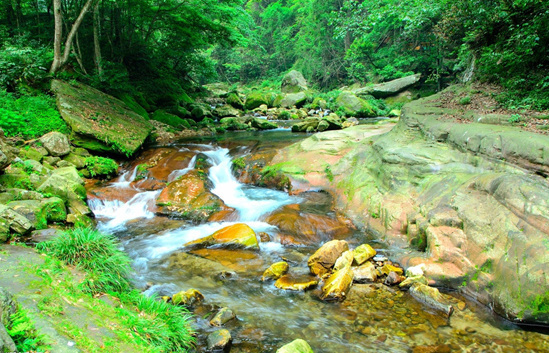 ????金鞭溪是天然形成的一條美麗的溪流,因金鞭巖而得名。溪水彎彎曲曲自西向東流去,即使久旱,也不會斷流。走近金鞭溪,滿目青翠,連衣服都映成了淡淡的綠色。流水潺潺,伴著聲聲鳥語,走著走著,忽然感到一陣清涼,才覺察有微風習習吹過,陣陣襲來的芬芳使你不由得駐足細細品味。清澈見底、纖塵不染的碧水中,魚兒歡快地游動,紅、綠、白各色卵石在水中閃亮。陽光透過林隙在水面灑落斑駁的影子,給人一種大自然安謐靜美的享受。