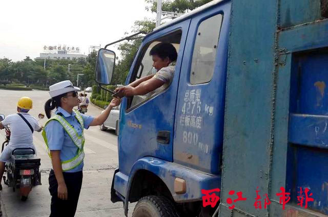 ????當天下午,長洲交警大隊正在新興三路凱萊大酒店對開路段設卡查車,整治運輸車輛的各類交通違法行為。16時30分左右,交警人員攔下了一輛外地號牌的中型貨車。由于該車違反了《道路交通安全法》中有關貨物長、寬、高方面的規定,交警人員依法對貨車司機進行了處罰和教育。“這么小的違章你們都要罰我?!北M管接受了處罰,但貨車司機還是有些不服氣地說道。