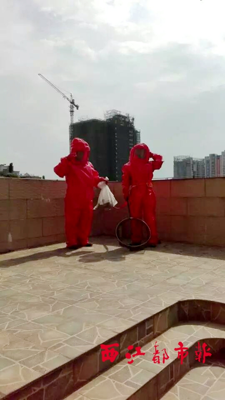 ????8月16日下午,廖師傅帶著兩個助手來到了潘女士家中。經過現場觀察,廖師傅很快制定了摘馬蜂窩的方案。只見廖師傅的兩個助手員穿上專業的防蜂服,帶上編織袋以及殺蟲劑,身上綁好安全帶,在將近50米高的墻邊,探出半個身子旋于半空中,一只手拿網,另一只手拿棍把馬蜂窩桶入網中。期間,盡管馬蜂不斷攻擊著兩名操作人員,但是面對厚厚的防蜂服,瘋狂的馬蜂也無計可施。事后,廖師傅還向蜂巢位置噴灑了殺蟲劑以防止馬蜂再次筑巢??吹今R蜂窩的問題被順利解決,潘女士一顆懸著的心總算落了地。