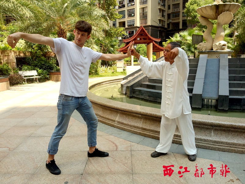 ??? 近段時間,在御山帝景小區的花園里,一位穿著太極服、精神抖擻的老人帶領著幾位年輕人練習太極拳。其中,一位高個子、白皮膚、棕頭發的洋小伙吸引了過往行人的視線。盡管動作略顯生澀,但他的神情十分專注,每當老師稱贊地對他豎起大拇指時,他都會露出靦腆而開心的笑容。