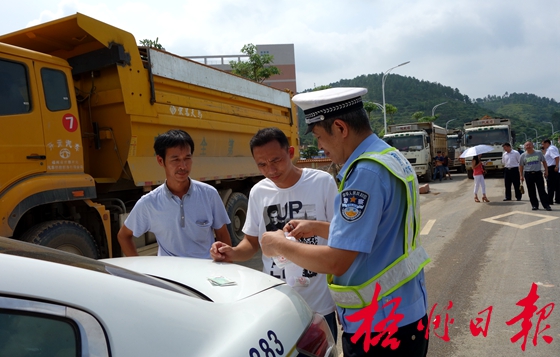 8月20日,在蒼海公園旁的東環路,泥頭車專項整治聯合行動組執法人員對違規泥頭車進行處罰,責令車輛所屬公司立即停工,并停止該公司在我市參與招投標的資格。 梁萍 攝