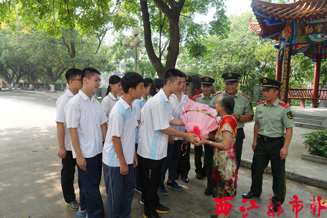 梧州一中高中部的新生代表和梧州邊檢站官兵一起,向歐潔芳老人贈送獻花表示敬意。西江都市報記者 龍天傳/攝