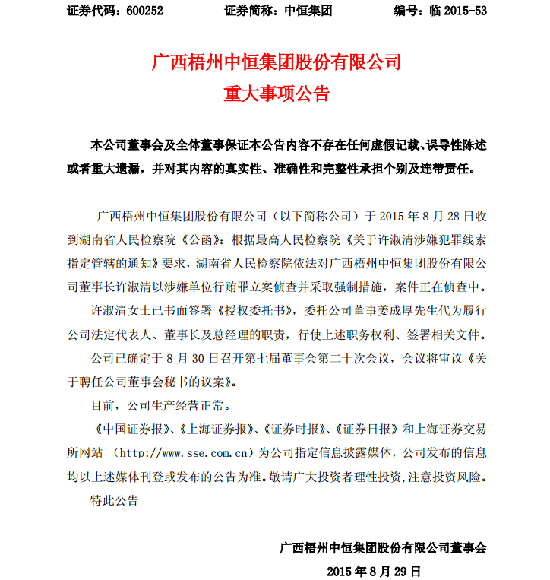 公告稱,許淑清已書面簽署授權委托書,委托公司董事姜成厚代為履行公司法定代表人、董事長及總經理的職責。目前,公司生產經營正常。公開資料顯示,許淑清,女,漢族,1958年6月生,北京人。2006年,許淑清正式入主廣西梧州中恒集團股份有限公司,任董事長兼總裁。